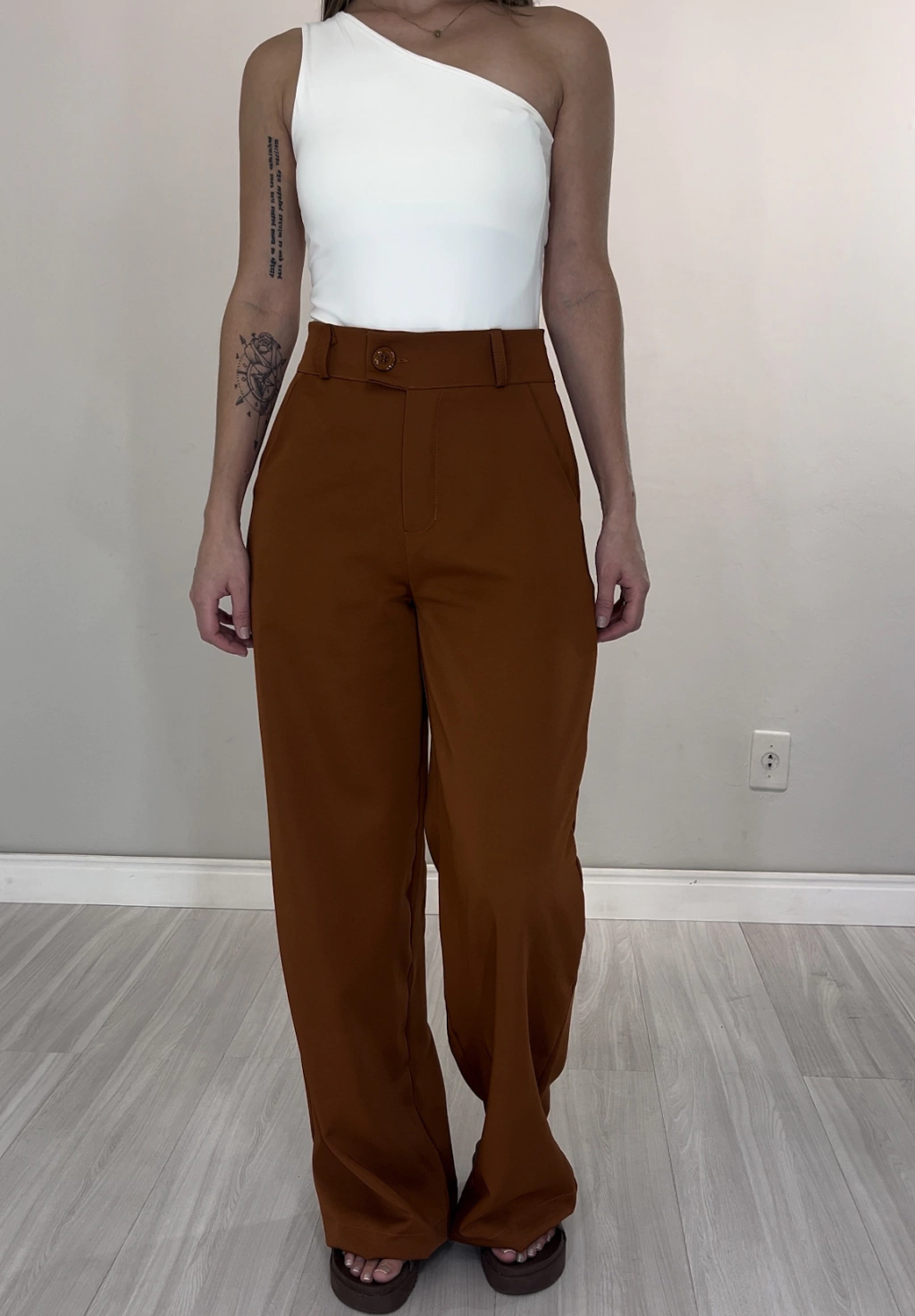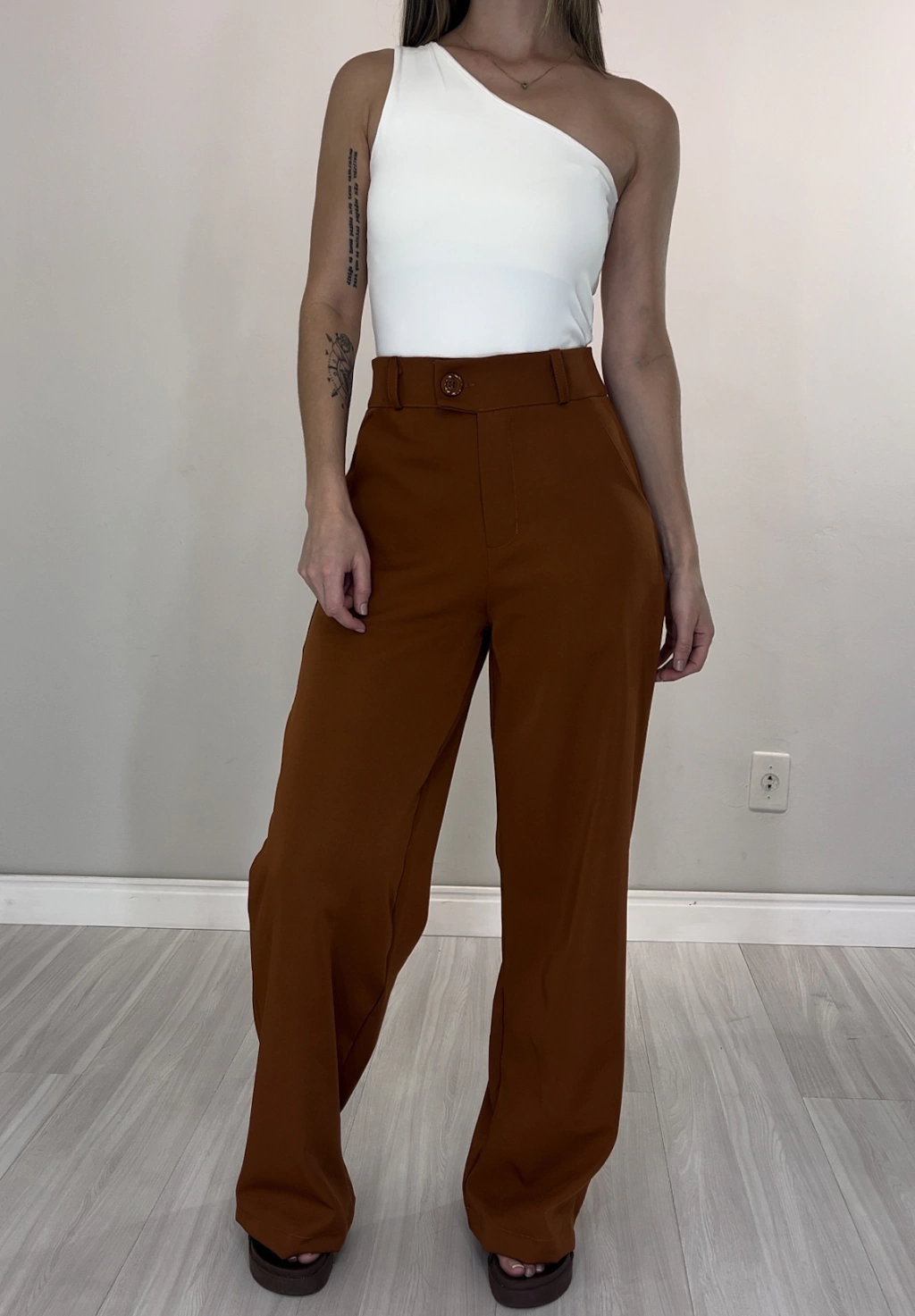 Calça com modelagem alongada e cós cintura alta, possui dois bolsos frontais. Calça versátil podendo assim ser usada em looks casuais ou formais.