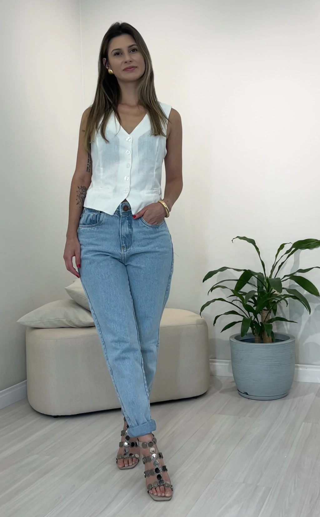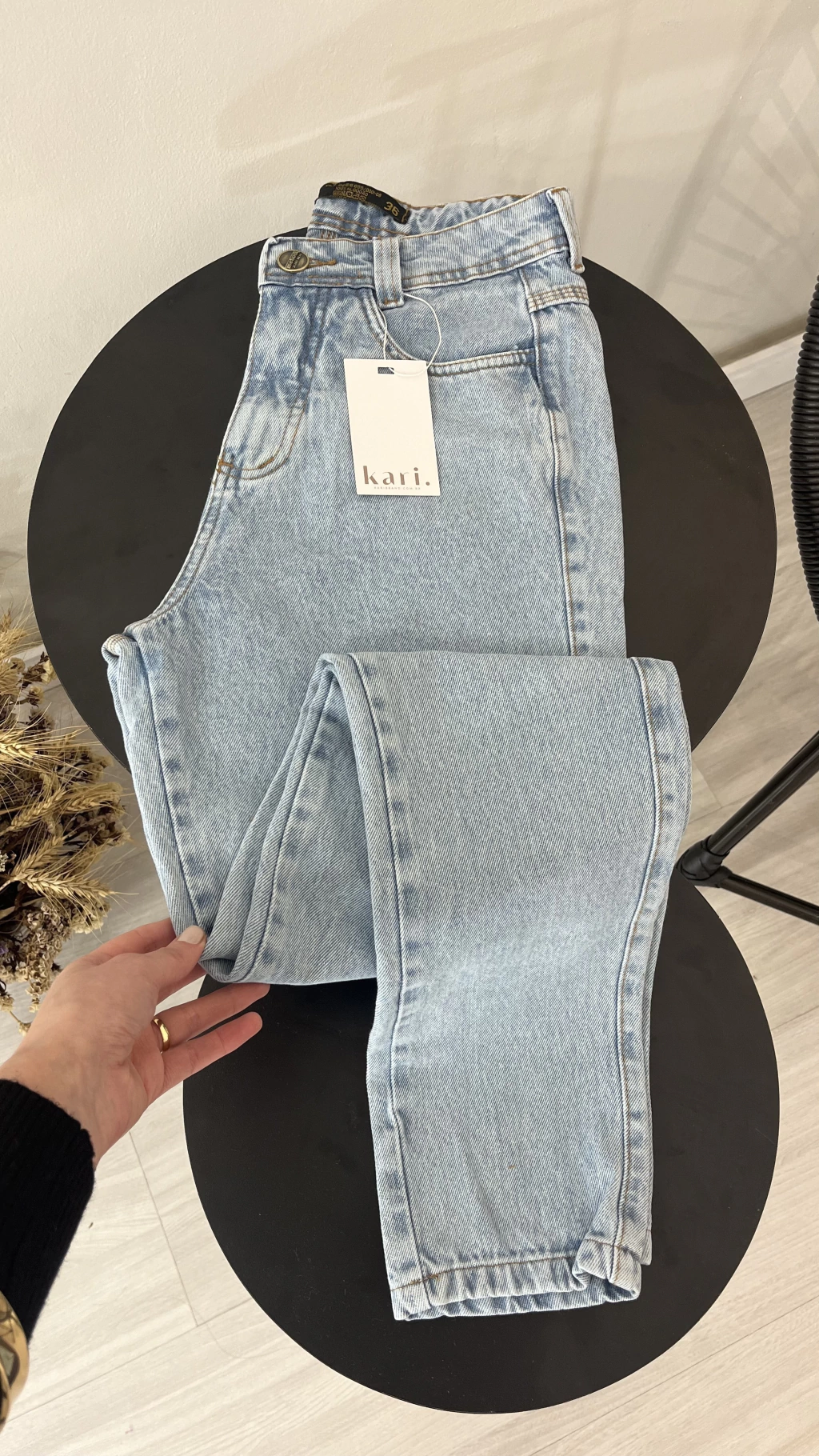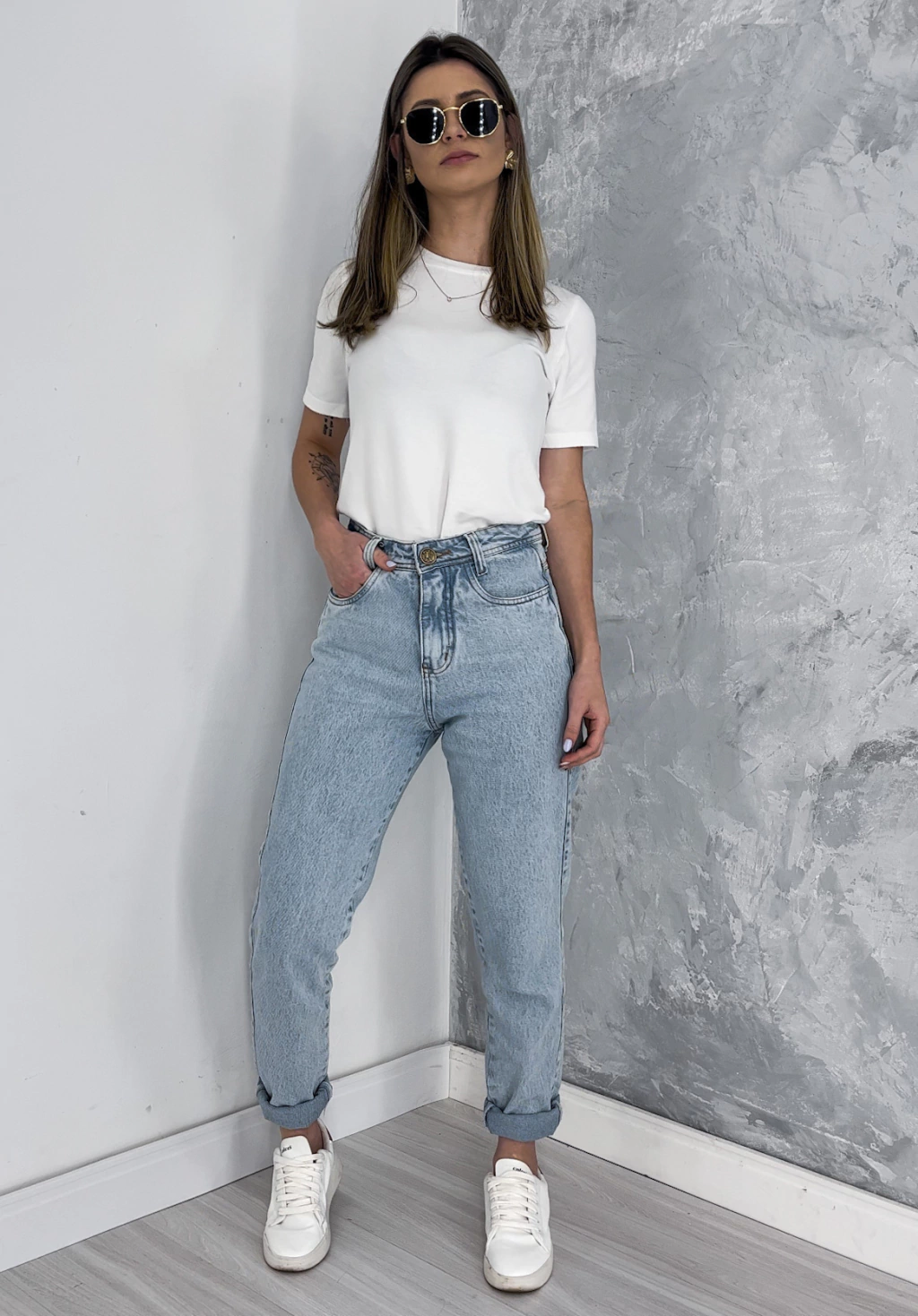 Calça jeans, com corte reto, cintura alta e modelagem mom. Clássica e coringa.