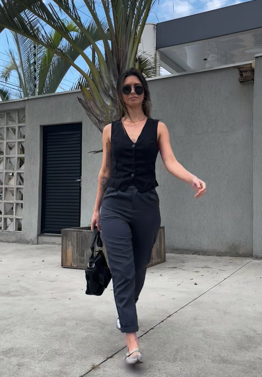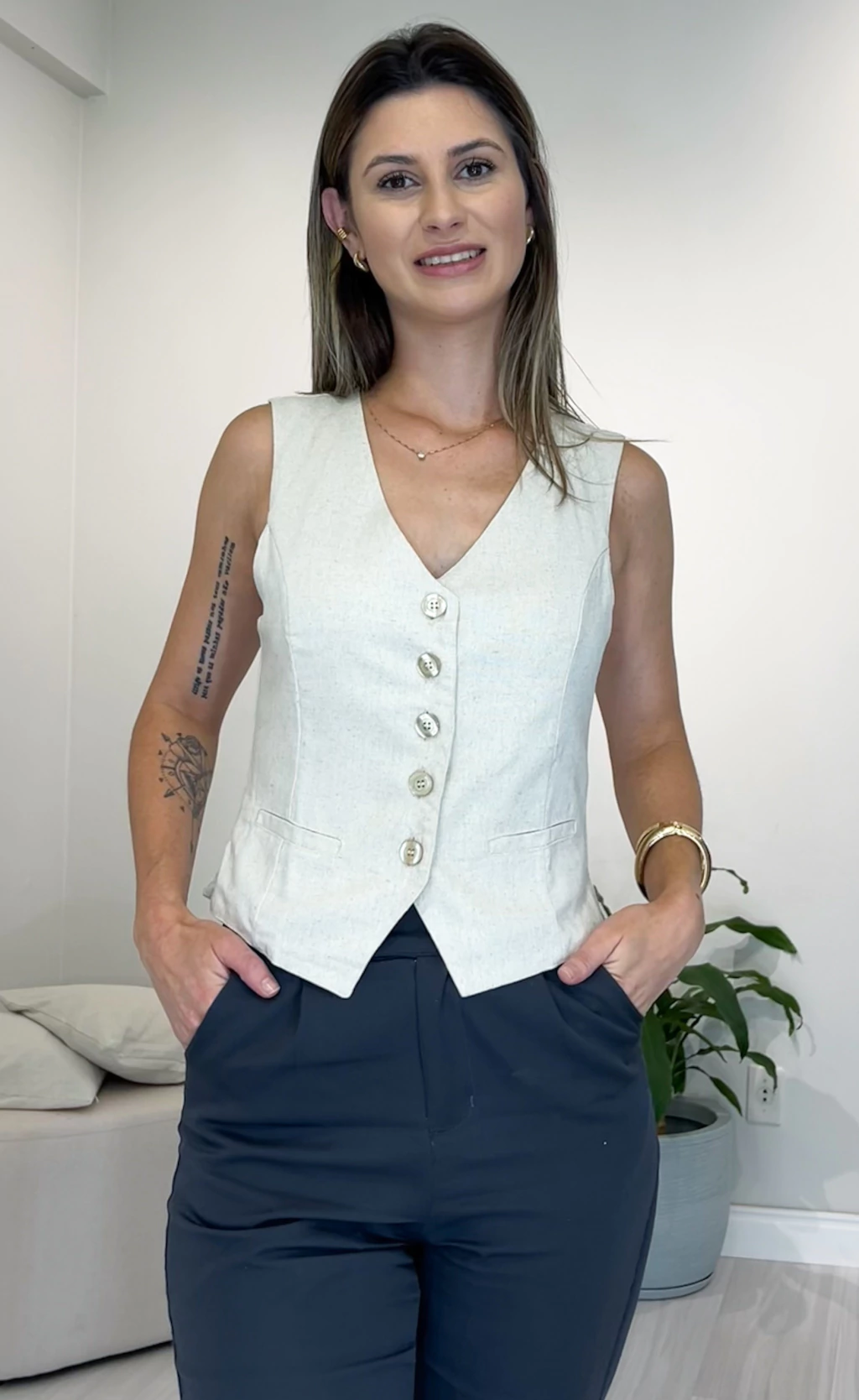 Colete confeccionado no tecido de linho misto, modelagem ampla com uma leve abertura na lateral e detalhe de bolso fake na frente. O colete possui 5 botões e um leve decote em V , peça atemporal e verstil para compor looks incriveis.