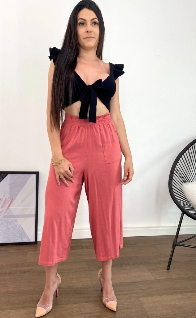 Calça modelo pantacourt, confeccionada em viscose sub prime.