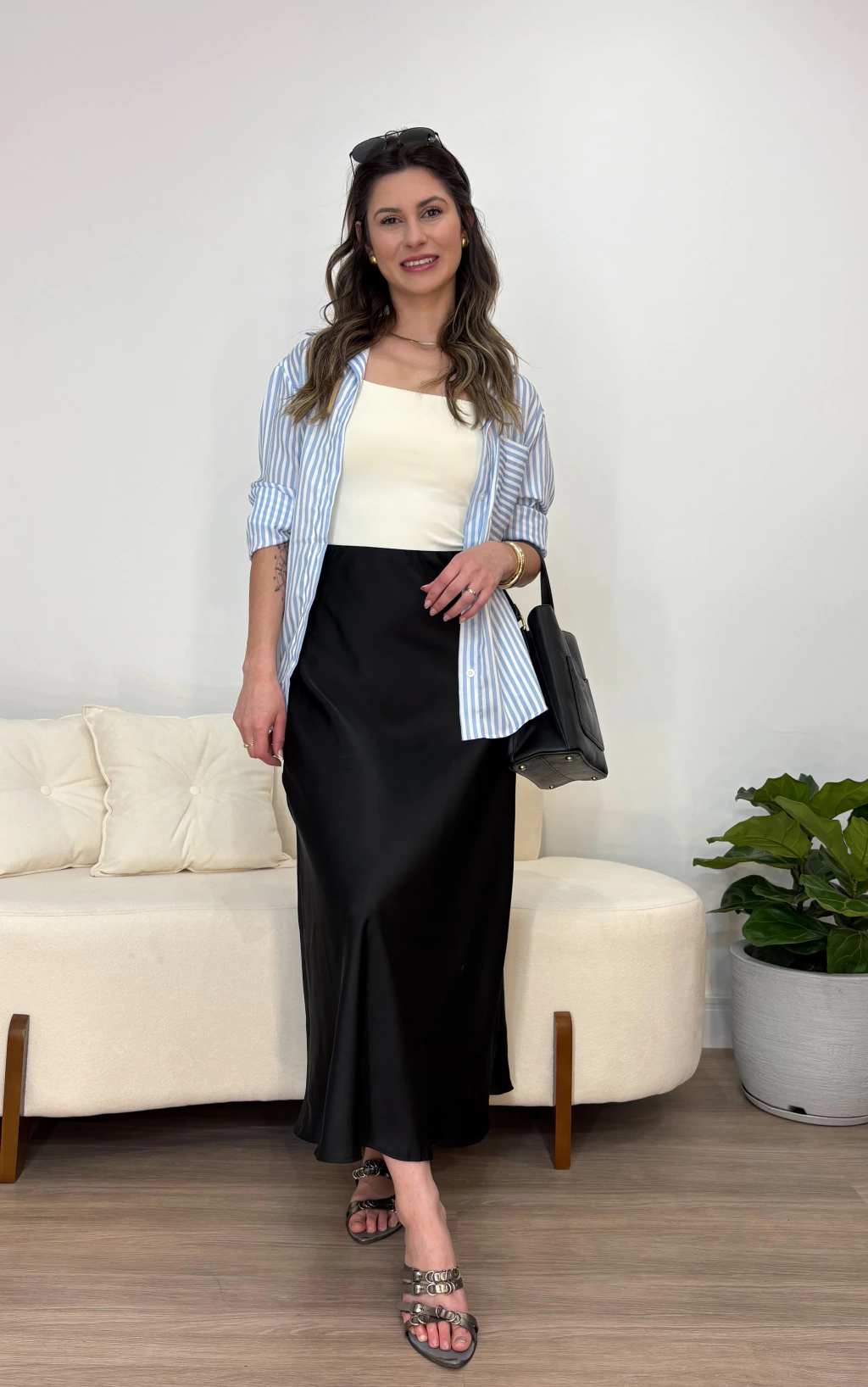 Sofisticação e versatilidade definem essa saia com modelagem evasê. Confeccionada em tecido levemente acetinado, ela proporciona um caimento fluido, toque macio e visual elegante. A modelagem acinturada com leve abertura em "A" valoriza a silhueta e garante liberdade de movimento, tornando-a ideal tanto para ocasiões especiais quanto para composições estilosas no dia a dia.