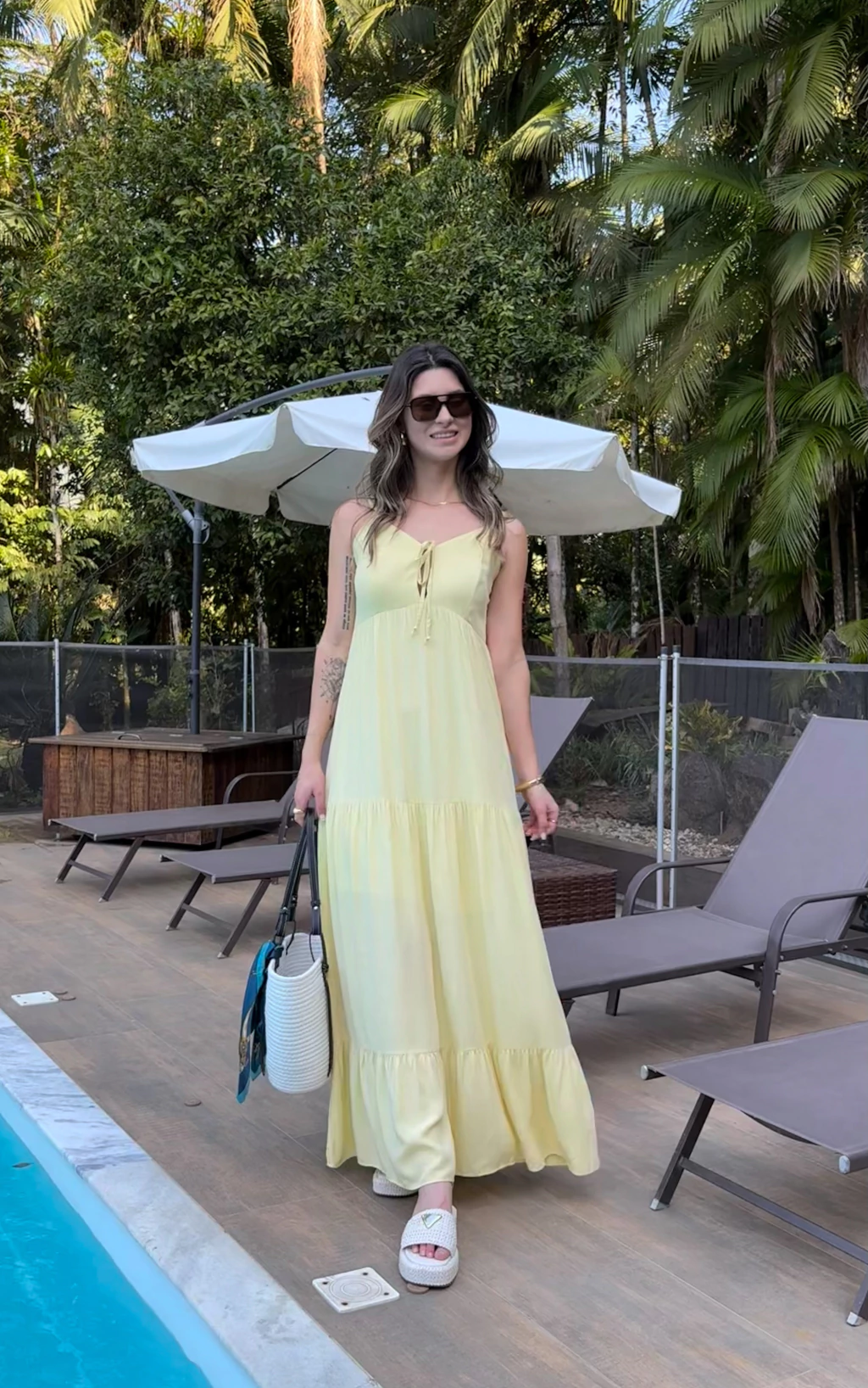 - Amarração no busto e nas costas, que permite ajuste personalizado e valorização da silhueta.
