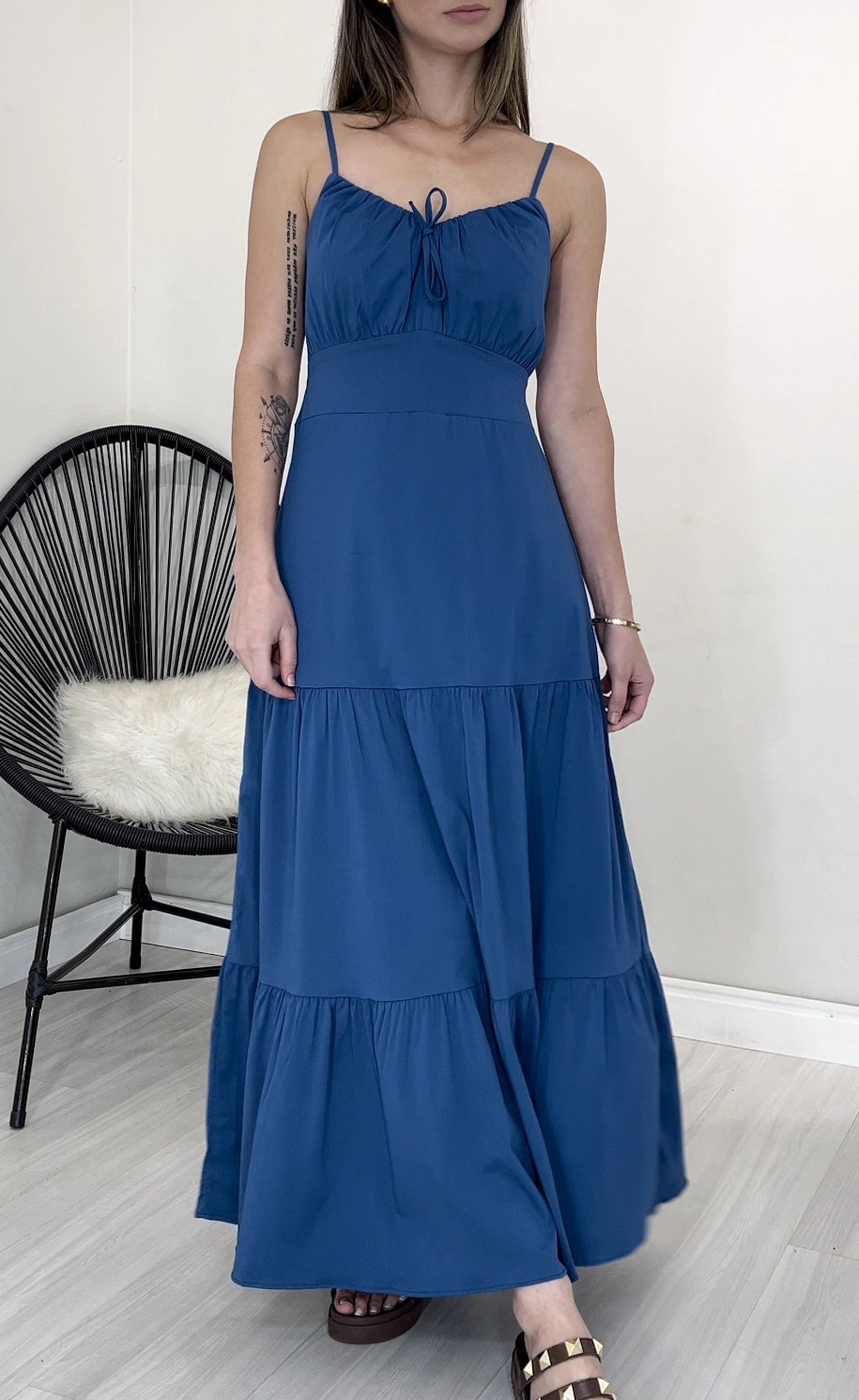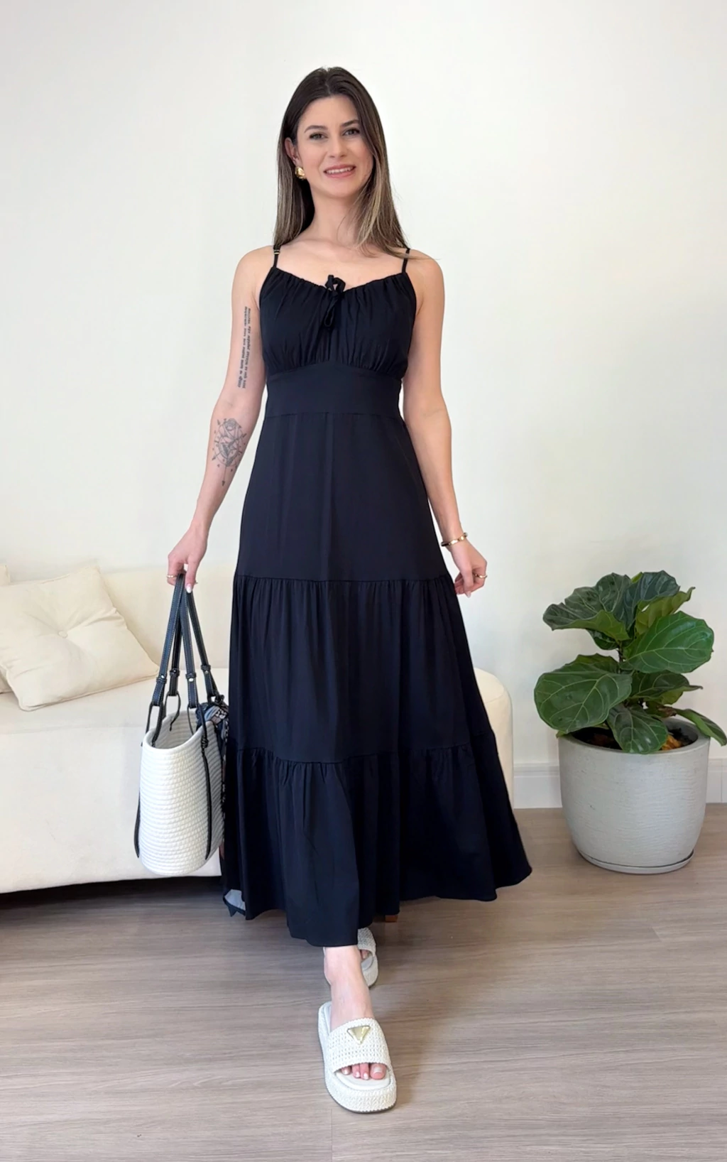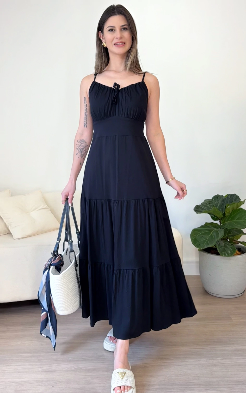 O Vestido Lívia é a definição de conforto e estilo. Feito em viscose sarjada, ele tem um toque suave e um caimento impecável. As alças reguláveis e o lastex nas costas garantem um ajuste perfeito ao corpo, enquanto o recorte acinturado valoriza a silhueta de forma natural.